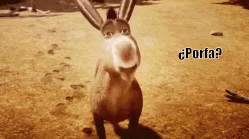 Donkey from Shrek makes a pleading face with a wide smile, asking 'Please?' in Spanish.