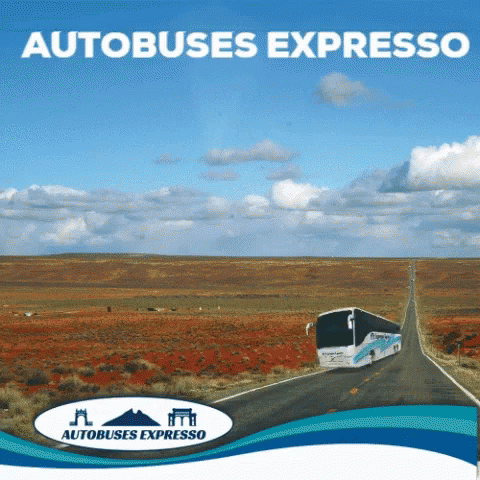 An advertisement for Autobuses Expresso, featuring a bus driving on a long, open road under a blue sky.