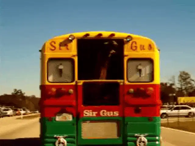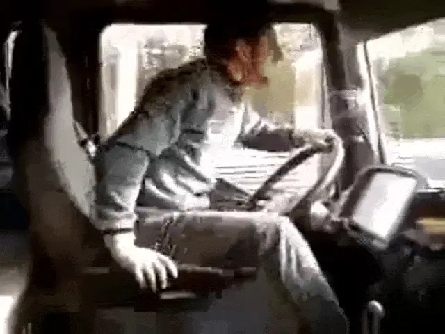 Míka on a bus, looking out the window with a 'hmmmmm' sticker visible.