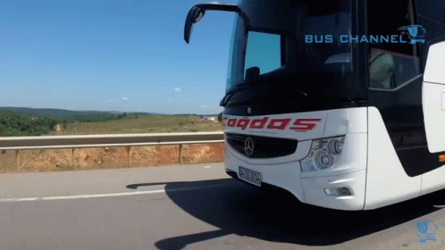 A white and black Çağdaş Mercedes-Benz bus drives on a highway under a clear blue sky.