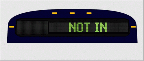 A digital bus sign displaying the message 'NOT IN SERVICE' in green text, indicating the bus is out of operation.