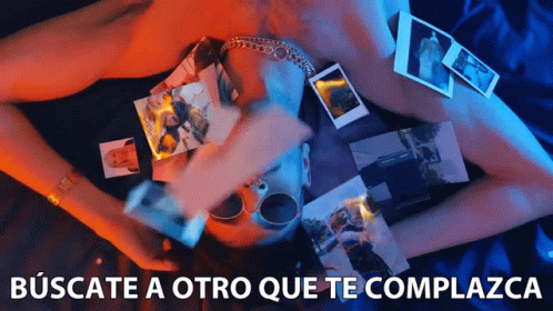 Bejo lies on a bed surrounded by photos, with the Spanish text 'Búscate A Otro Que Te Complazca' displayed.