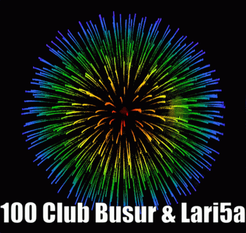 Vibrant fireworks display celebrating '100 Club Busur & Lari5a' with colorful bursts against a dark sky.