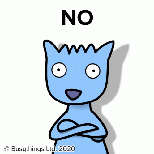 A blue Busythings cat with crossed arms shakes its head, clearly saying 'NO' to something.
