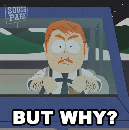 Sergeant Harrison Yates from South Park looks confused, asking 'But Why?' while driving his car.