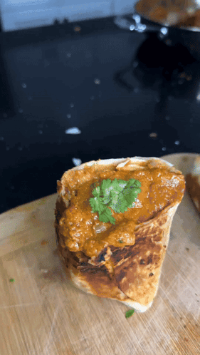 Delicious butter chicken burrito-style sauce on toasted bread, garnished with fresh cilantro.