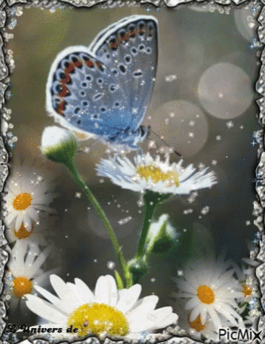 A beautiful blue butterfly with sparkling wings rests on a white daisy, surrounded by shimmering light.