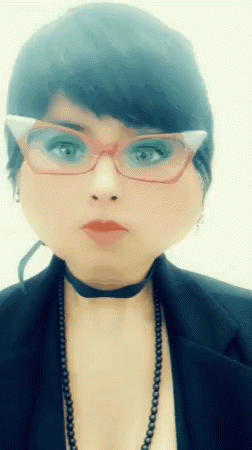 A woman with short hair, red cat-eye glasses, and a choker necklace makes a 'Buu Triste' pouty face.