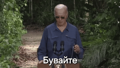 Joe Biden says 'Бувайте' (Goodbye) and walks away from a podium in a lush, green jungle setting.