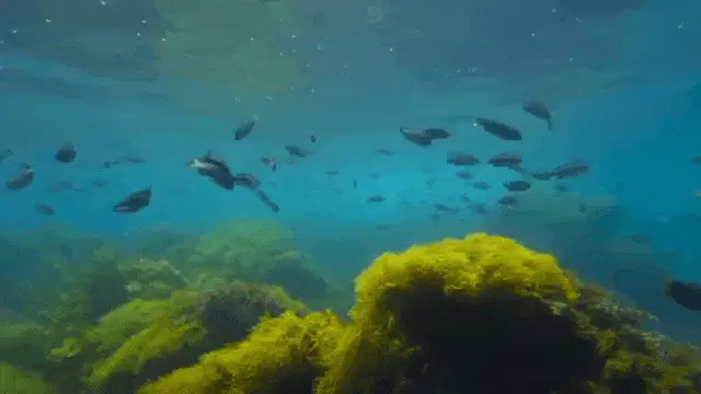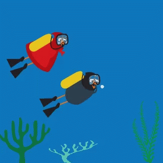 Animated character Filiberto and a friend, depicted as bird-like scuba divers, swim underwater among coral and seaweed.