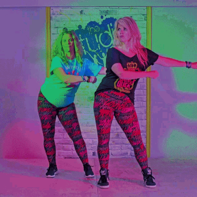 Two women from Buzzmasters The Studio perform an energetic dance workout, moving in sync with vibrant lighting.