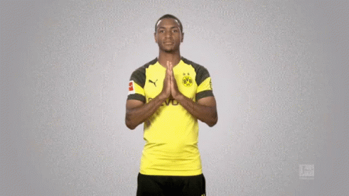 Borussia Dortmund player Diallo in his yellow jersey, making a prayer or thank you gesture.