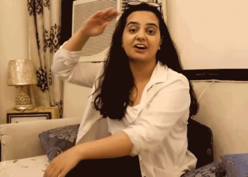 Anvika Raghav sitting on a couch, making a 'bye bye' gesture with a salute and speaking to the camera.