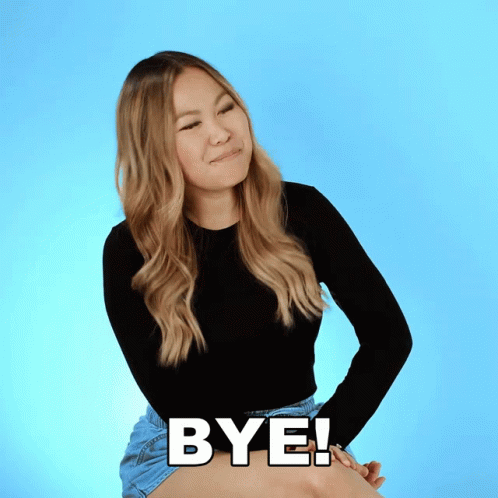 Ellen Chang smiles and waves goodbye while sitting in a black top and denim shorts against a blue background.