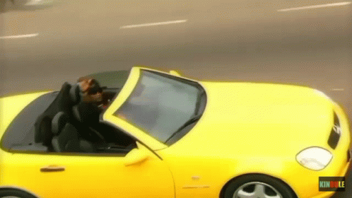Koffi Olomide waves from a bright yellow convertible car, driving down a street.