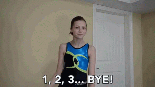 Bethany Grieve counts '1, 2, 3' and waves goodbye with a cheerful smile, wearing a blue and black leotard.