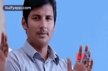 Actor Jeeva waves his hands with an expressive, slightly sad face against a blue sky.