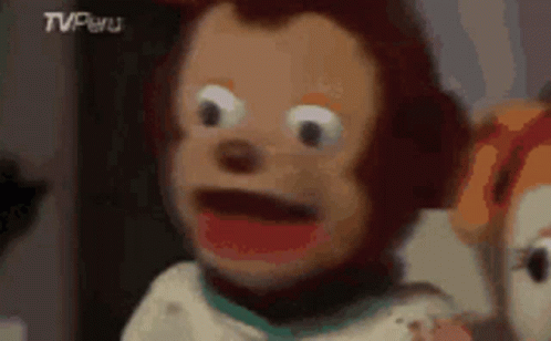 Byuntear Boneco, a monkey puppet, displays a wide-open mouth and a comically surprised expression.