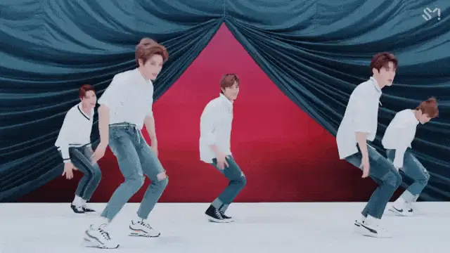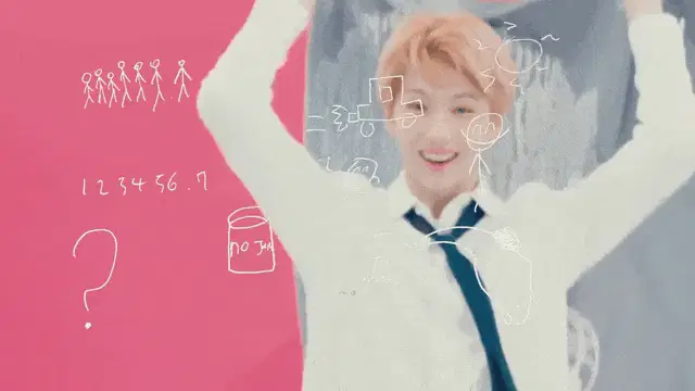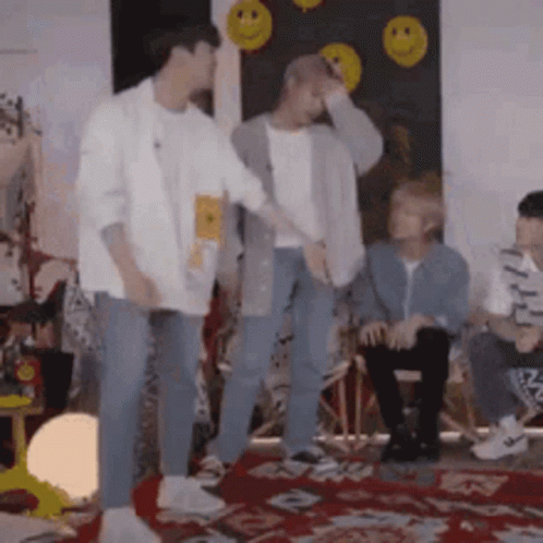 Renjun appears to faint or collapse while standing with a group of young men in a room with smiley face decorations.