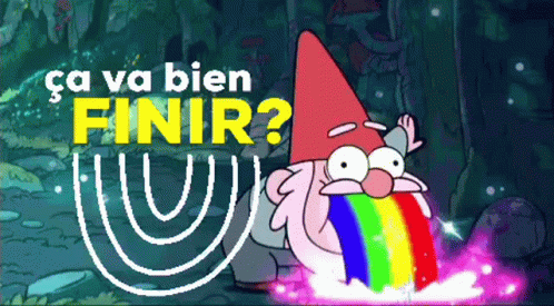 Cartoon gnome pukes a vibrant rainbow, with the French text 'ça va bien FINIR?' (Is it going to end well?)