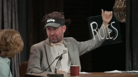 Brian Schottenheimer, wearing a Seahawks visor, holds up a "RULES" sign, referencing NFL defenses.
