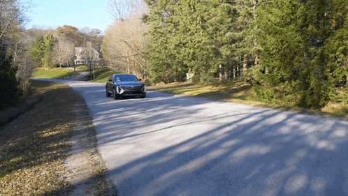 A sleek Cadillac Lyriq electric SUV drives along a tree-lined road on a sunny day, showcasing its modern design.