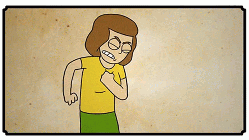 Animated woman in yellow shirt and green skirt appears to faint and falls out of frame.