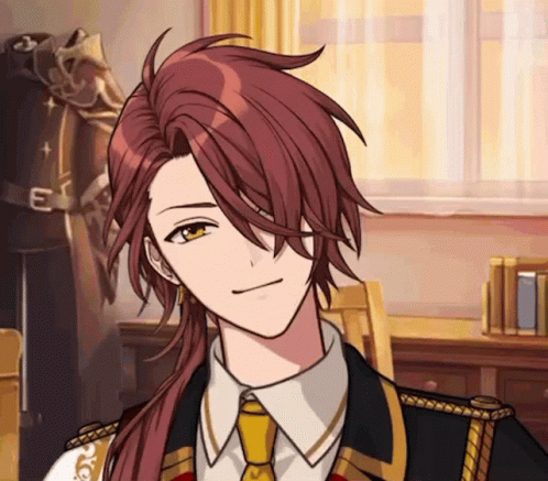 Cain Mhyk, a character with long red hair and yellow eyes, wearing a formal uniform.