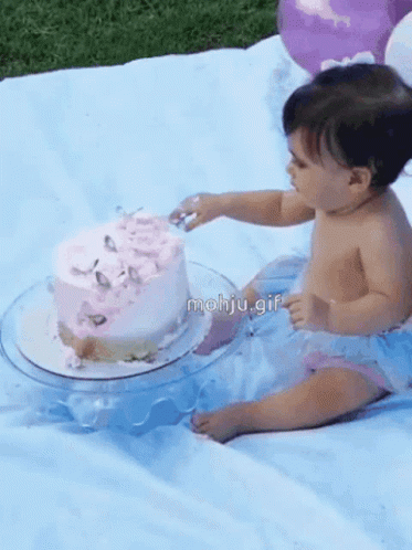 An adorable baby sits on a blue blanket, happily exploring a pink cake with their hands.