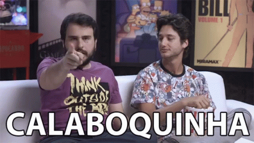 Two men on a couch, one points while the other playfully hits his face, with "CALABOQUINHA" text overlaid.