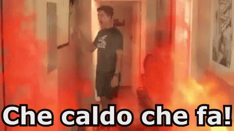 A person walks through a hallway engulfed in red light, exclaiming 'Che caldo che fa!' (How hot it is!).