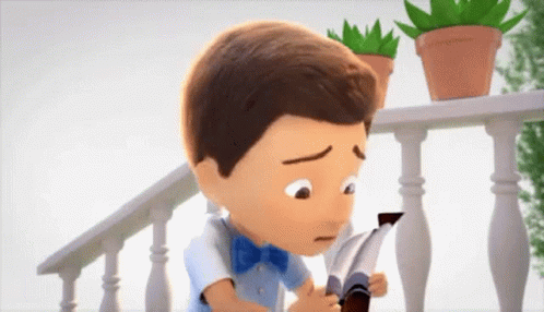 Caleb Olvidar, an animated boy in a bow tie, is engrossed in reading a book on a porch.