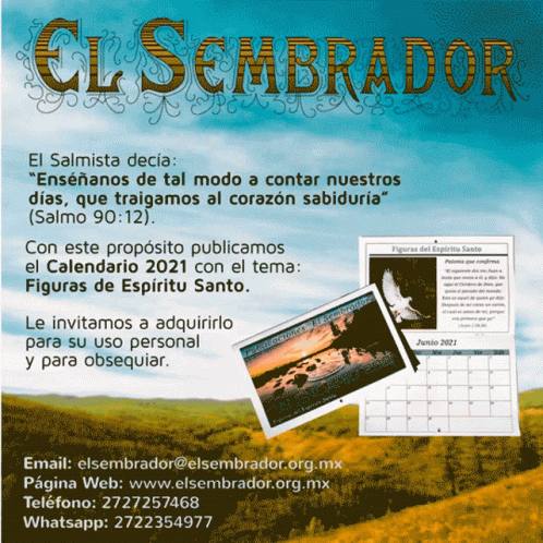 Advertisement for El Sembrador's 2021 calendar, themed 'Figures of the Holy Spirit', available for personal use or as a gift.