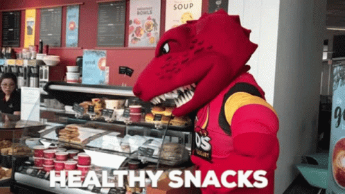 The Calgary Dinos mascot, Rex, stands by a display of healthy snacks, promoting nutritious food choices on campus.