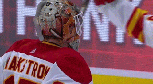 Calgary Flames players Jacob Markstrom and Matthew Tkachuk share a celebratory hug on the ice after a game.