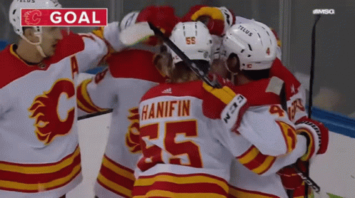 Calgary Flames players, including Blake Coleman and Hanifin, celebrate a goal against the New York Rangers.
