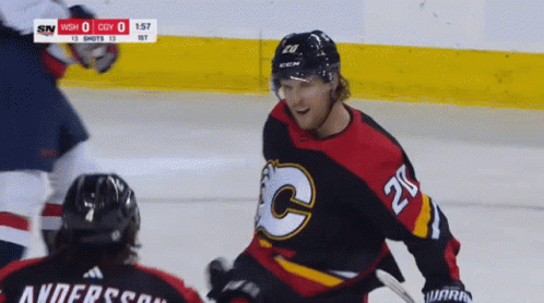 Calgary Flames player Blake Coleman celebrates a goal with teammates during an NHL game.
