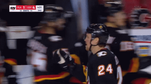 Calgary Flames player Brett Ritchie on the ice during a game, wearing jersey number 24 and covering his mouth.