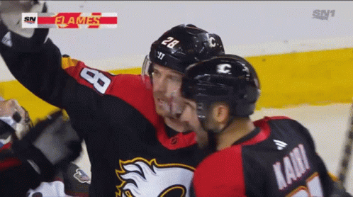 Calgary Flames player Elias Lindholm celebrates a power play goal with teammates on the ice.