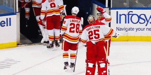 Matthew Tkachuk and Jacob Markstrom of the Calgary Flames share a celebratory hug after a win.