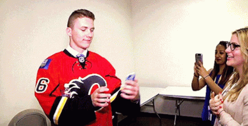 Matthew Tkachuk, wearing his Calgary Flames jersey, poses for a selfie while another person takes a photo.