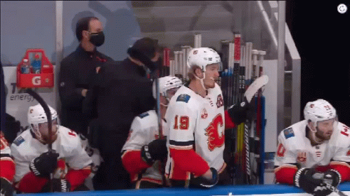 Matthew Tkachuk, wearing his Calgary Flames jersey, stands up and leaves the hockey bench.
