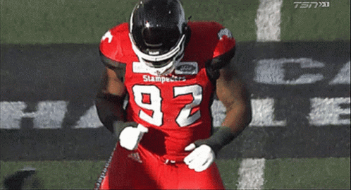 Calgary Stampeders player Ese Mrabure celebrates on the field with a dance after a play.