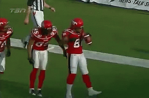 Calgary Stampeders football players celebrate a touchdown with a happy dance on the field.