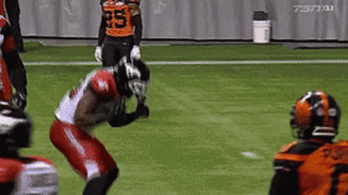 A Calgary Stampeders football player celebrates on the field during a Canadian Football League game.