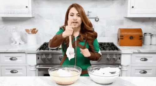 A person in a green outfit mixes ingredients for a cauliflower dish in a bright kitchen.