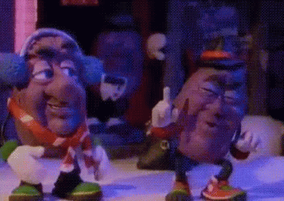 Animated California Raisins characters singing and dancing on stage, dressed in winter attire.