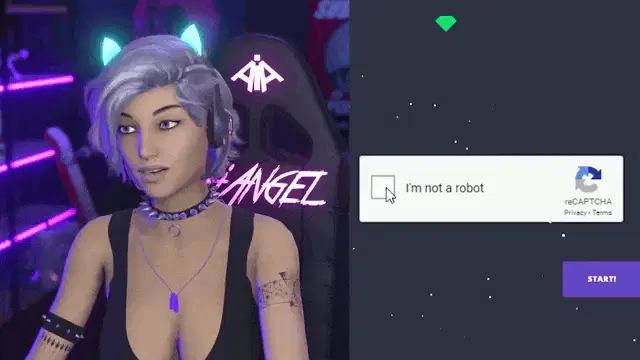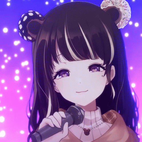 Calista Arp, the VTuber, smiles sweetly while holding a microphone against a sparkling purple background.