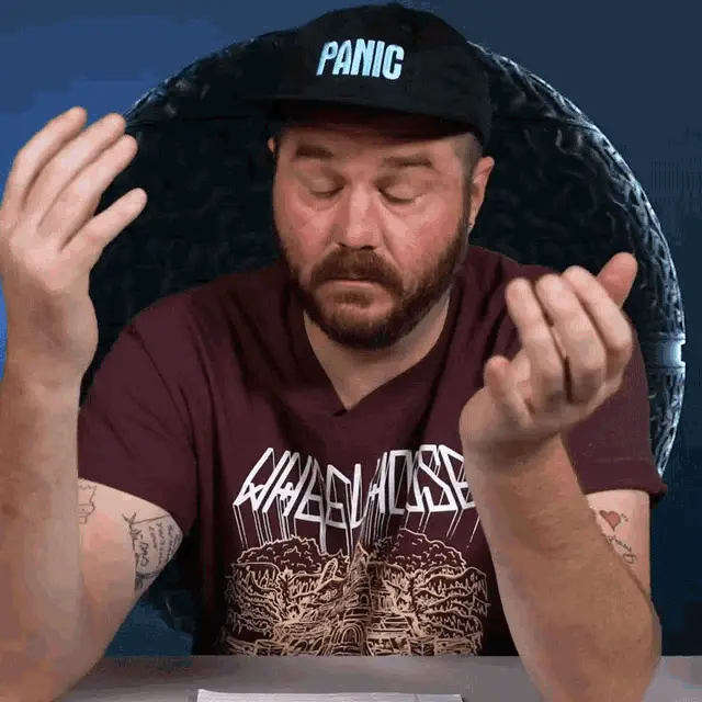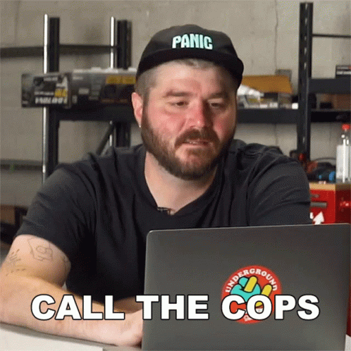 Nolan Sykes reacts with 'Call The Cops' while sitting in front of a laptop, wearing a 'PANIC' hat.