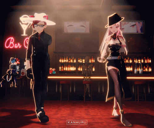 a man and a woman are standing in front of a bar sign